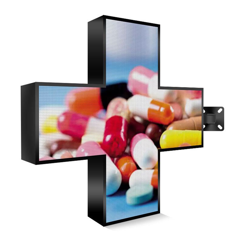 Krzyż apteczny multimedialny zewnętrzny, full kolorowy telebim apteczny LED w kształcie krzyża, przeznaczony do wyświetlania prezentacji multimedialnych w rozdzielczości P4. Nowoczesne chipowe diody SMD marki Nationstar o dużej jasności świecenia, wysokiej luminacji i szerokim kącie świecenia zapewniają doskonałą widoczność wyświetlanych treści nawet w mocno nasłonecznionych lokalizacjach. Doskonała jakość, dokładność, wyrazistość i czytelność obrazu. Dobrze widoczny z daleka i mocno świecący z możliwością regulacji mocy świecenia. Zakres kolorów pełen - ponad 16,7 mln kolorów. Odległość odczytu 4m-40m.